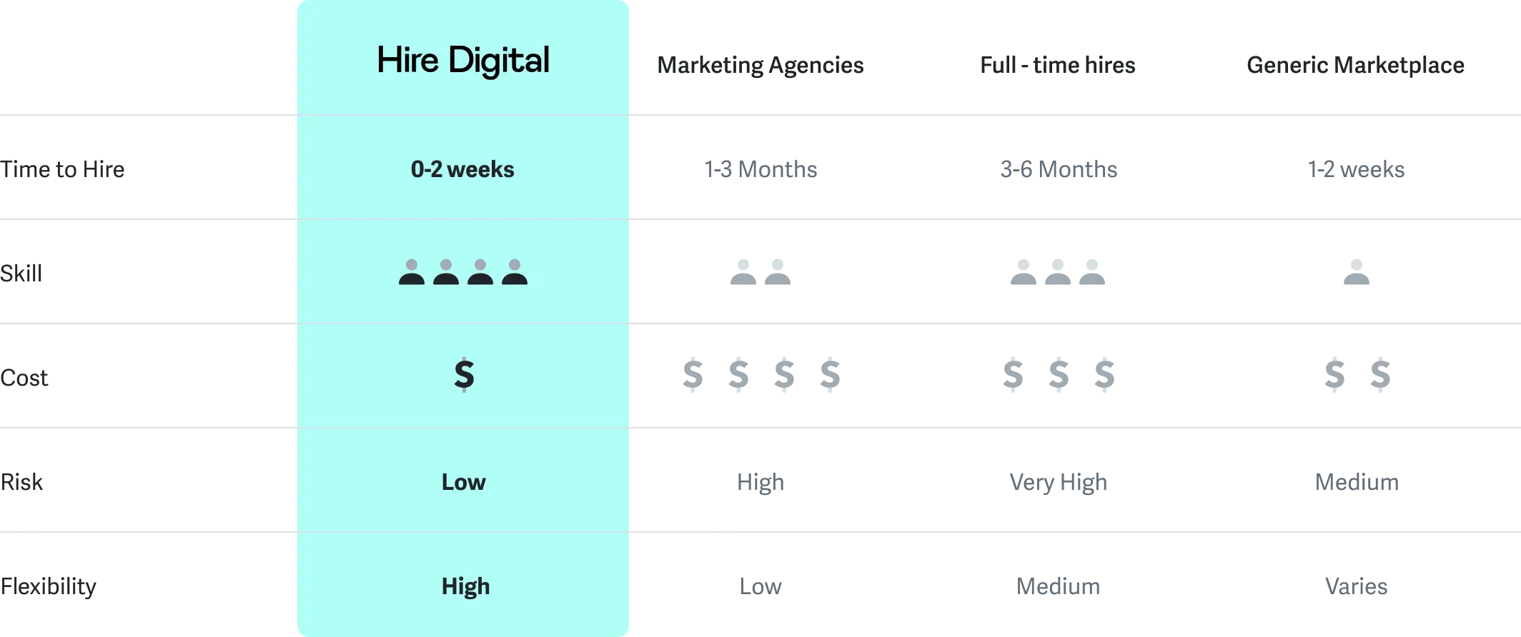 Our exclusive network includes experts across a wide array of skills in marketing, design, and development. Take a look at the freelance profiles matched to your desired skills.